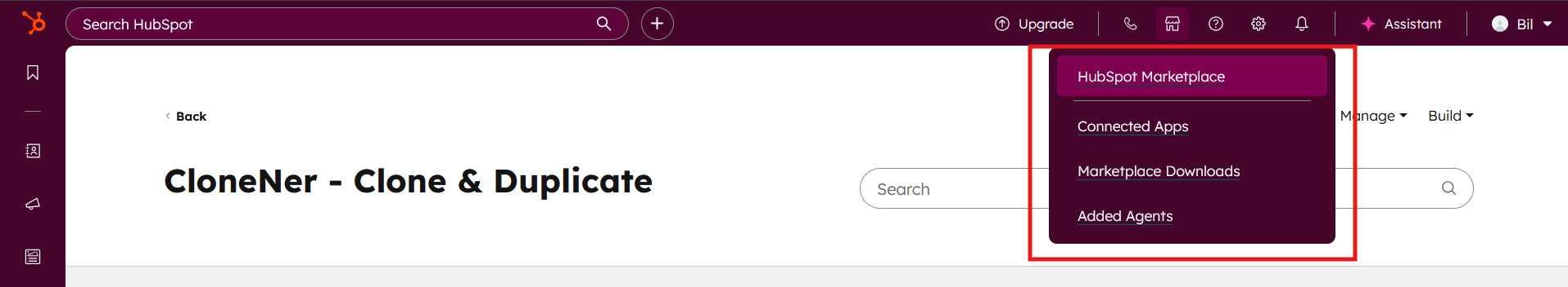 π In your HubSpot account, click the Marketplace icon in the main navigation bar. Under Manage, select Connected apps.