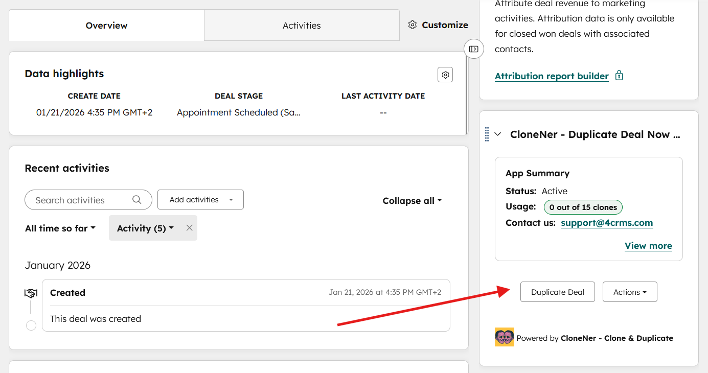 β οΈ NOTE: You may need to scroll down in the right sidebar to find the 'CloneNer - Clone & Duplicate' widget, as HubSpot typically places new app widgets towards the bottom of the sidebar by default.If preferred, you can rearrange the sidebar elements to display the 'CloneNer' card higher than the drag-and-drop option in the list (per object type, per HubSpot user). |