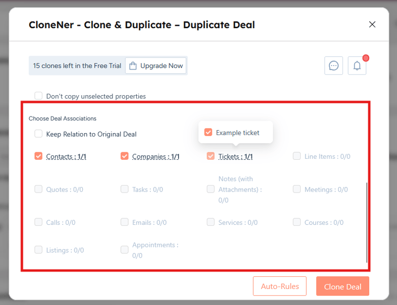 π Effortless Duplication: Quickly clone deals, tickets, quotas, tasks, notes, line items, and related contacts, including custom objects, all in just a few clicks.