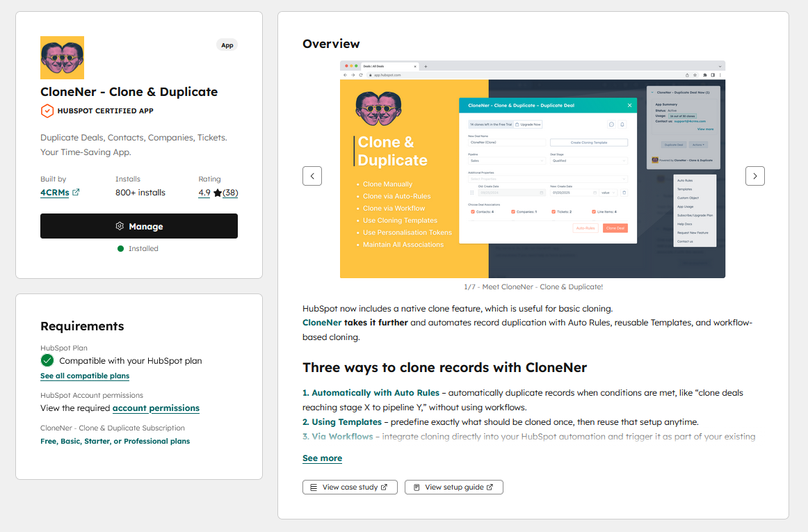π Please note: By clicking on the screenshot image bellow you will be redirected to the HubSpot Marketplace CloneNer App listing profile.