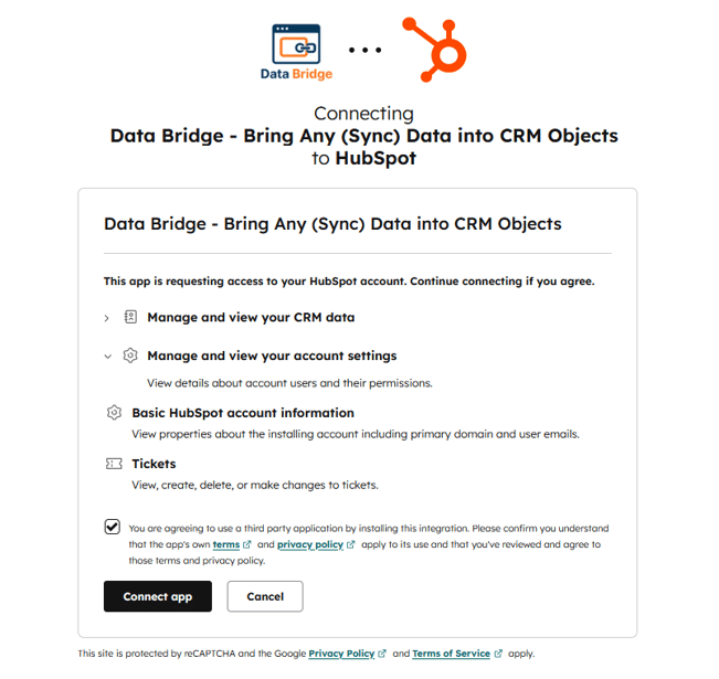 Note: We are noticing some issues with "the HubSpot’s new app installation" process. It may prompt you to log in, but our Data Bridge app does not require that step. Once you see the screen above, the app is already installed in your portal and ready to use.