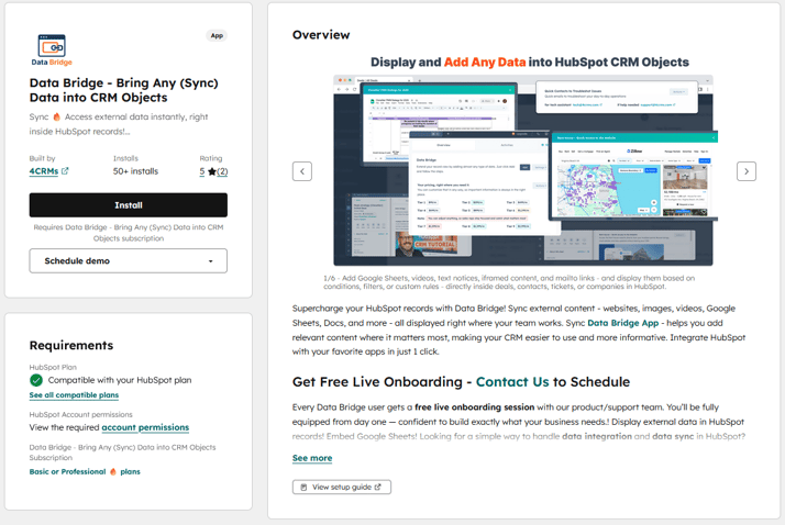 - Go to the HubSpot App Marketplace and search for DataBridge.