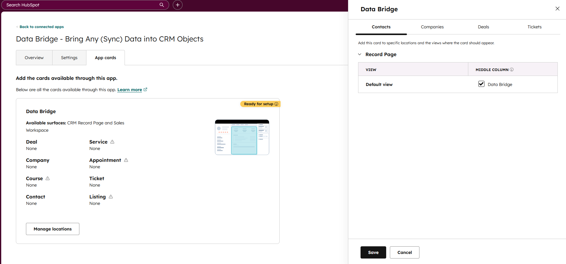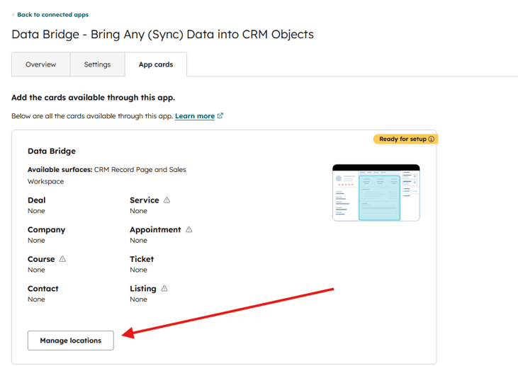 - Go to Connected Apps and add the card to a record. Find Data Bridge, open it, and use Manage Location to turn on/display the app in your objects (Company, Tickets, Deals, Contacts, etc.).