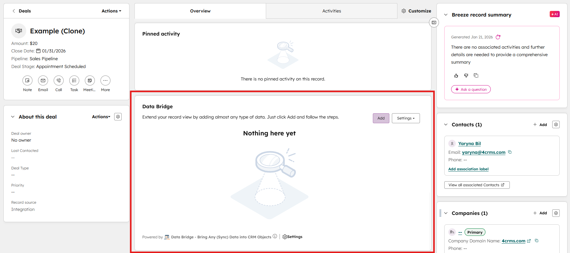 - Once installed, open any Deal or Contact record in your HubSpot CRM.