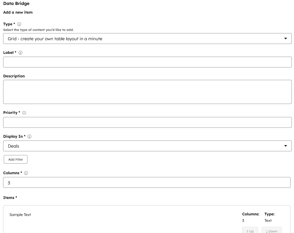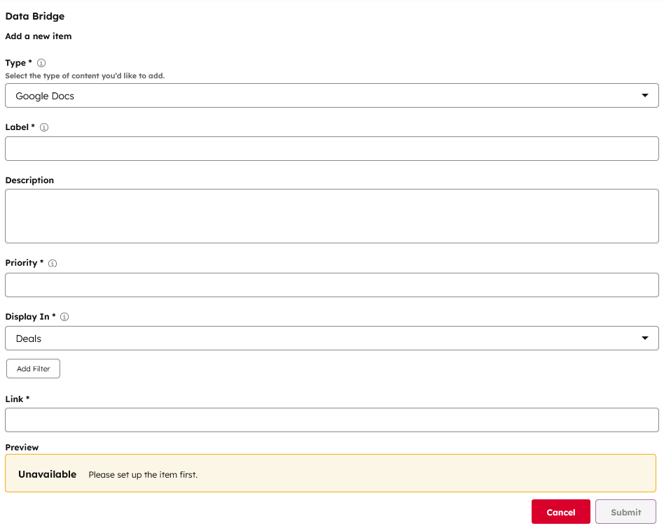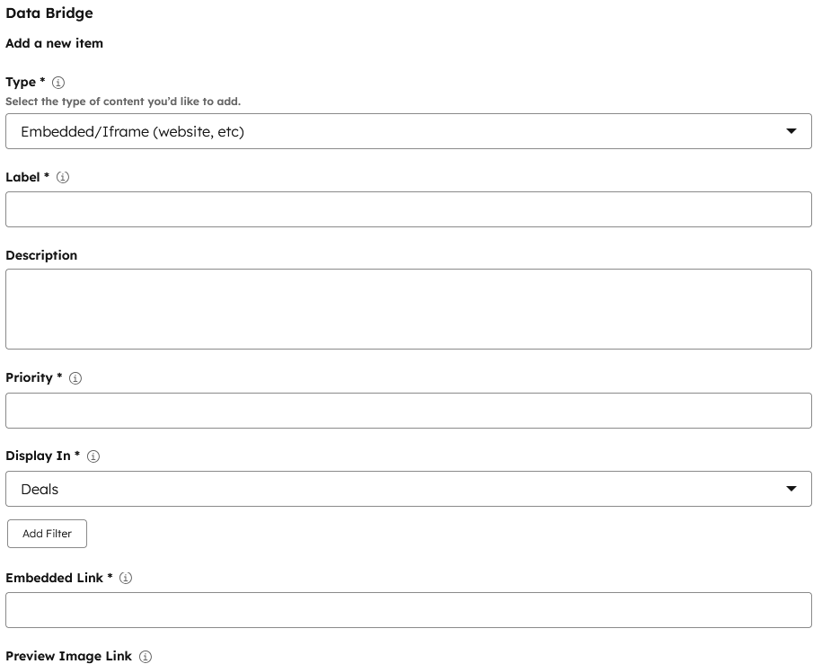 You can add multiple types of content using public links, and for HubSpot Professional users, Data Bridge can even appear as its tab next to Overview and Activities.