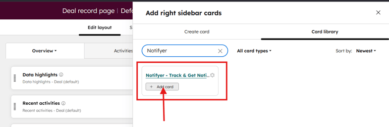 To get the Notifyer card inside your deal record, you should follow the next steps: