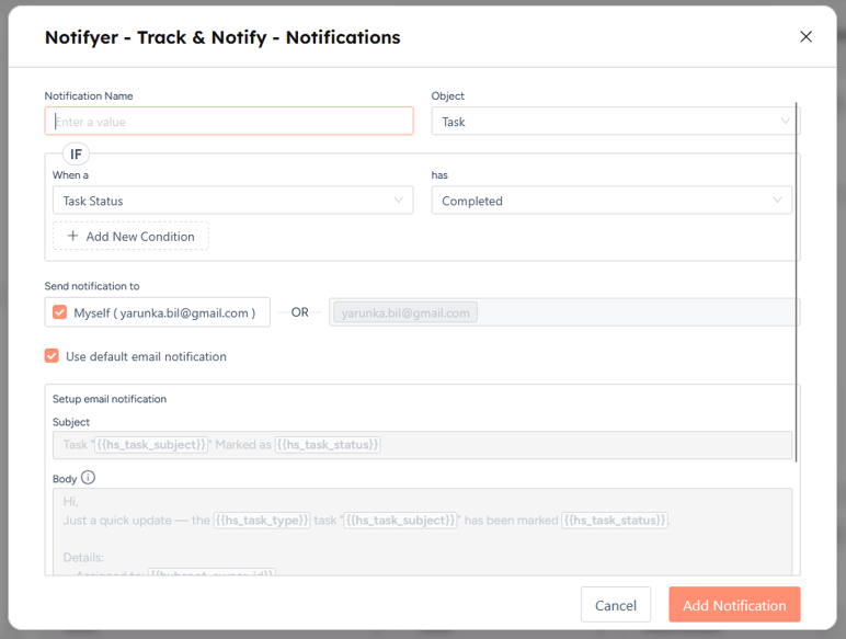 We built Notifyer for teams who need more flexible, condition-based email notifications directly from tasks like calls, to-dos, or emails in HubSpot. Whether you're managing tasks for multiple reps or running tight pipelines, Notifyer helps you stay on top of things, without building custom code or relying on limited native alerts.